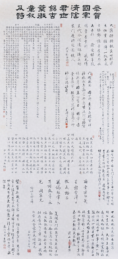 この3幅は、15年に及ぶ佐賀藩執政としての抜群の勤労により鍋島安房茂真(須古邑主/10代佐賀藩主鍋島直正庶兄)が花杏葉紋を拝領したことに対し、当時の知名士による祝賀の詩歌や文章の寄せ書きである。枝吉彰(南濠)・武富定保・野田包郁・前山長定(清一郎)・岩村貞高・草場佩川・張 弘・相良頼善・枝吉経種(神陽)、南里有隣などの名がみえる。
