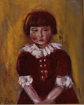1932(昭和7)年、三岸好太郎が故郷札幌に帰郷して2ヶ月ほど滞在していた折に制作した作品。画友でもあった本間紹夫の次女を描いている。本間は札幌で印刷会社(北海石版印刷所)経営の傍ら、北海道美術協会(道展)の創立会員として絵画や版画、工芸を制作し活躍、また道展運営の中心的役割を担っていた。三岸は本間と親しく交友し、北海石版所のプレス機を用いての版画制作も行っている。