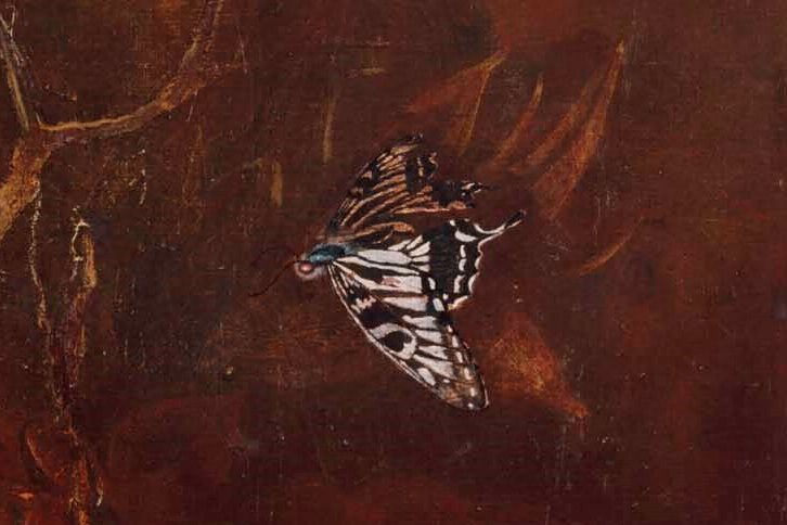 一方で,混とんとした全体とは対照的に,画面右上の一羽のチョウは,極めて写実的かつ細密に描かれ,全体の色調に従わず白く浮かび上がる。凍り付いたかのようなチョウは死を想起させるが,本作品がはらむ生と死のイメージは,花園というには余りに暗い植物の茂みとチョウとの間で絶えず交錯し反転する。