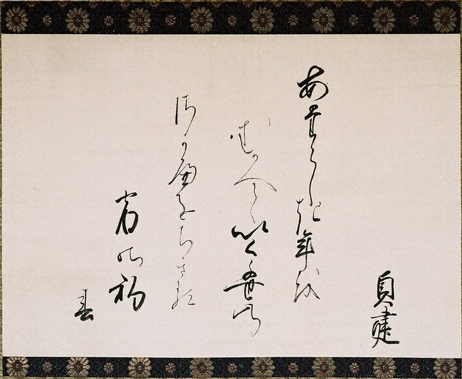 鎌倉時代末の皇統、持明院統の伏見天皇は平安時代の上代様と呼ぶ和様を復興された名筆で知られ、その流れを伏見院流と称し、その伝統を見せる清廉な連綿体が美しい。改まった懐紙には見られない自由な散らしの中に、室町時代に定まった一句三句五句の墨継ぎが濃淡の奥行きとなっている。年頭の自詠の御和歌である。