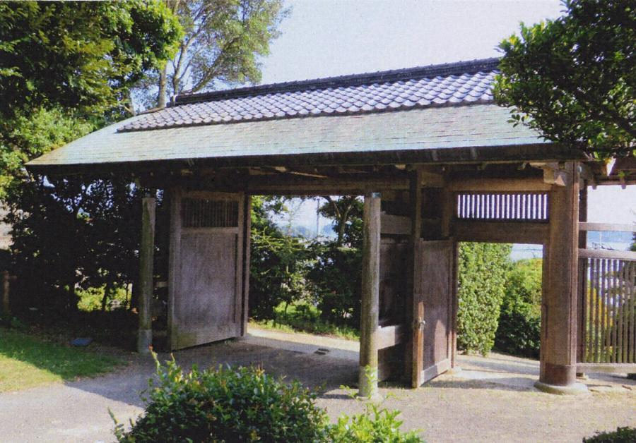 主屋南東に建つ間口三間の腕木門。切妻造桟瓦葺で軒と螻羽は銅板一文字葺とする。本柱は円柱で女梁、男梁で桁を受け、中央間に控柱を立てる。軒は一軒疎垂木。門扉は屋久スギの一枚板を使い、脇間に欄間を入れて潜戸を吊り、両袖塀が付く。雄大な構えの表門。