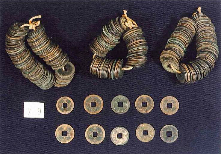 穴空き銭は,6500枚を超える寛永通宝が残される。また,渡来銭は,数は少ないが,唐から清時代までのものがあり,日本で模造され,流通したとおぼしき銭も認められる。