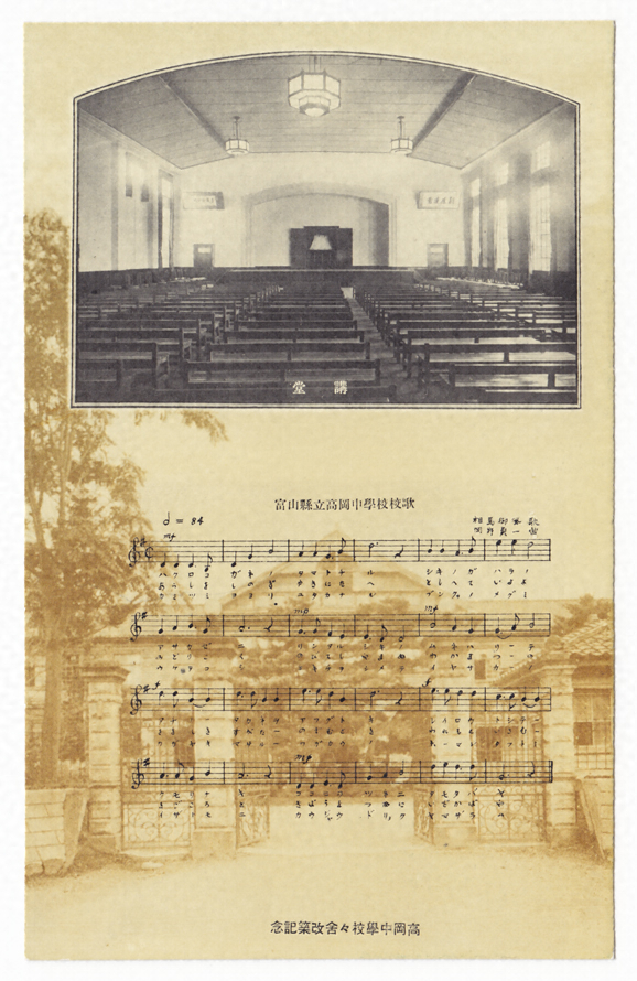 校舎前・裏景や校旗、武道場、体育館、講堂などの写真が使用されている。また、写真の背景には、立山や古城公園などの写真、校歌の楽譜が印刷されている。