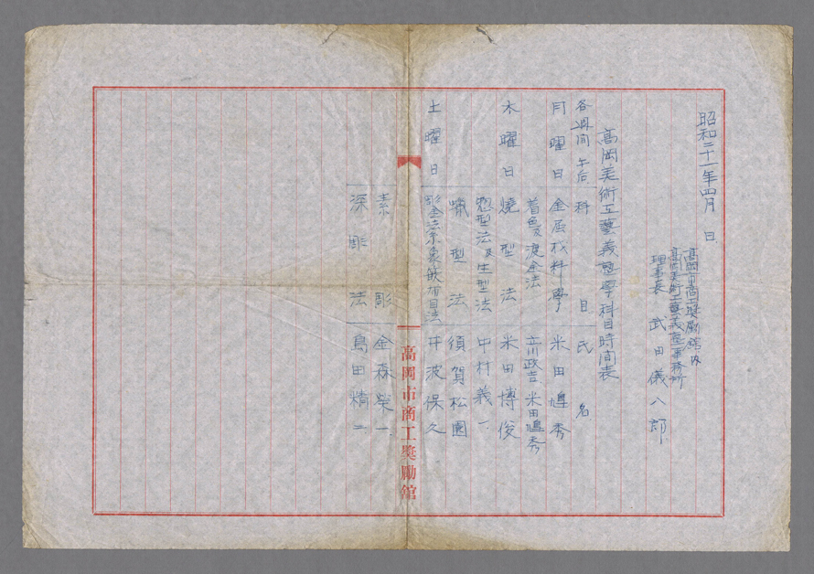 たかおかびじゅつこうげいぎじゅくがっかもくじかんひょう