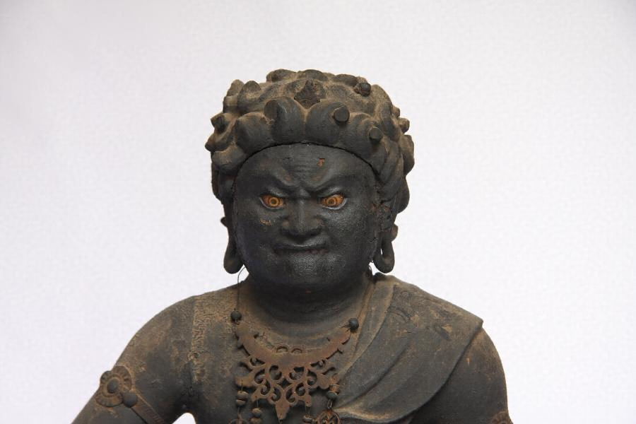 頭頂に莎髻を結い、地髪は巻き毛で、左肩に弁髪を垂らす。両眼は慎目で、上歯で下唇を噛み、耳朶は環状で三道を彫出する。顔を前に向け、条帛、裙、腰布を着け、半跏で左足を下げる。左手は肘を下にして胸脇に構え、掌を上に五指を握り羂索(欠)を執る。右手は肘を外にして腰脇に構え、掌を内に五指を握って宝剣を執る形だが、指先が欠損して宝剣(柄部欠)は別保存とする。