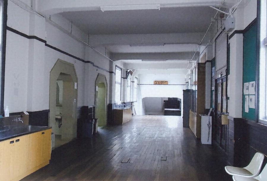 北館の南面中央と南館の北面中央を接続する。鉄筋コンクリート造二屋建、南北二一・八メートル東西四・六メートル、東面に平屋建の倉庫等を附属する。パラペットには雁振瓦をのせ、和風意匠を演出する。北館、南館とあわせて工の字平面の大型校舎を構成する。