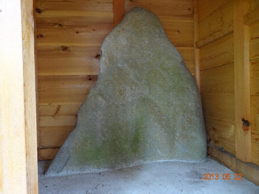花崗岩とみられる山形状の自然石で、塚上の小堂内に南面して立つ。