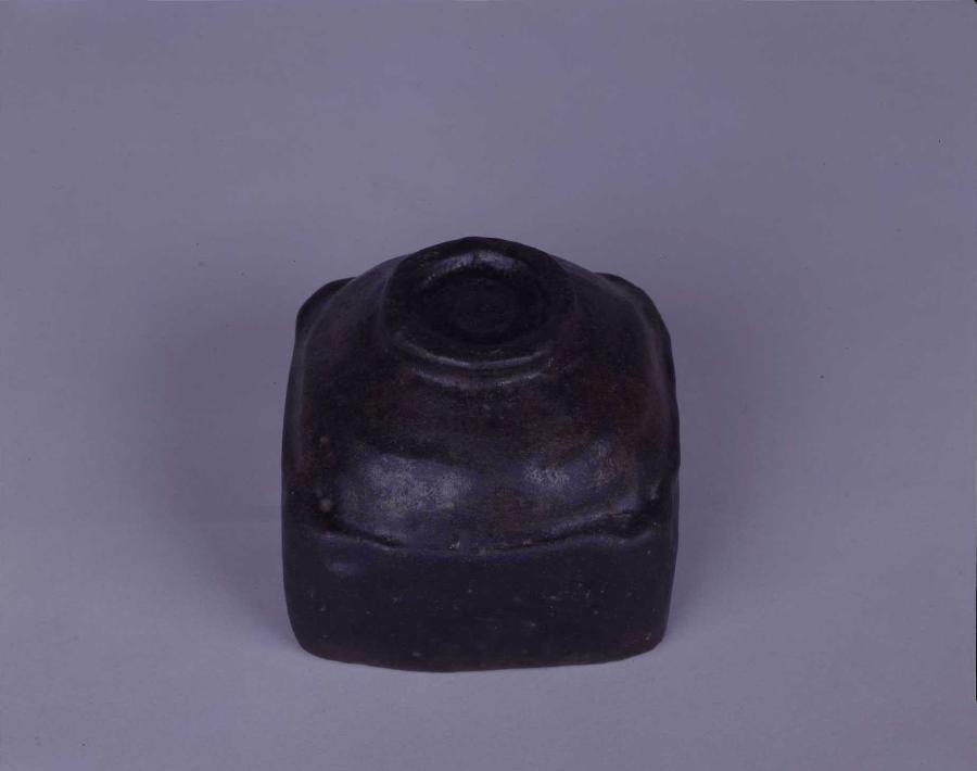 半筒形の胴を四方とし胴裾に丸みをもつ茶碗。素地は軟質陶胎、手捏ねで成形する。口縁をわずかに内に抱え込んで端部を丸く仕上げる。胴部は四方形とし腰との境には平らな段をわずかに作り出し、腰から高台までは丸く仕上げ、全体は厚手の整形となる。高台は小振りの円形で丸みを持ち、内を渦兜巾状に削り出し、境には幅広の浅い溝が廻り、高台端部には五箇の目跡がある。胴の内面には轆轤目風に穏やかな凹凸を作り出し、底部中央がやや大きく茶溜まり風にわずかに窪む。胴の一面には窯から引きだした時の鉄鋏の跡が残る。