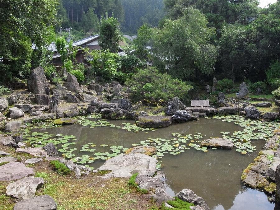 東西約30m,南北約25mの庭園の中央に中島を擁する石組みの池泉があり,庭園の北辺から東辺にかけて高さ約2mの築山が巡る。西岸の主屋縁先の飛び石及び南岸の園路を伝い歩くことにより,北岸中央に石で組んだ高低差約90cmの滝をはじめ,北西岸付近の築山の斜面に組んだ立石を中心とする景石(けいせき)群など,変化に富んだ築山泉水庭の景致を望むことができるほか,庭外には標高326mの大徳山(だいとくさん)を展望することもできる。また,明治4年(1871)の写本とされる彩色鳥瞰図(さいしきちょうかんず)に描く庭園の形姿からは,現在の庭園が幕末の状態を継承していることが判る点でも貴重である。