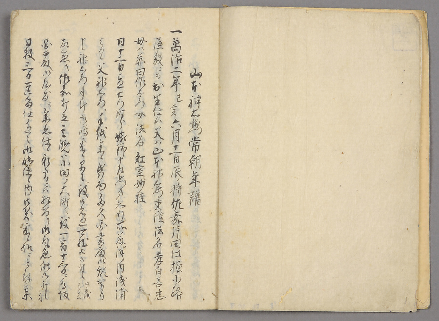 佐賀藩士山本常朝(神右衛門/1659~1719)が自筆で記した自らの年譜。冒頭には、「万治二年己亥六月十一日辰の時、佐嘉片田江横小路屋敷にて出生仕候。父は山本神右衛門重澄、法名孝白善忠。母は前田作右衛門女、法名紅室妙桂」とあり、出生の日時と場所、両親の記述から始まっている。常朝が誕生する五年前にあたる承応3年(1654)に製作された承応佐賀城廻之絵図には、「片田江北より五番横小路(中ノ橋小路)」の北側に、「山本神右衛門尉」として父重澄の名が見え、年譜で「片田江横小路屋敷」と略記されている生誕地の場所を詳細に知ることができる。