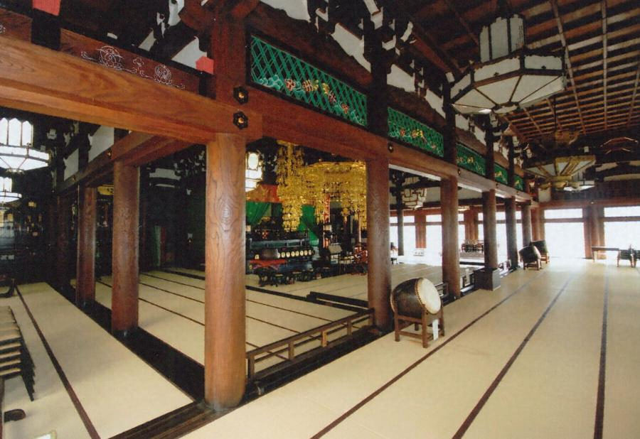 寺町通に向けて境内を開く。本堂は七間四方で、内陣を五間四間と広くとるなど日蓮宗系寺院本堂の標準的平面を示す。広い内陣を確保するため、側柱を立て登らせ、トラスを併用して大スパンを実現する。細部は古典に忠実で、天沼俊一の設計として初期の大型仏堂。