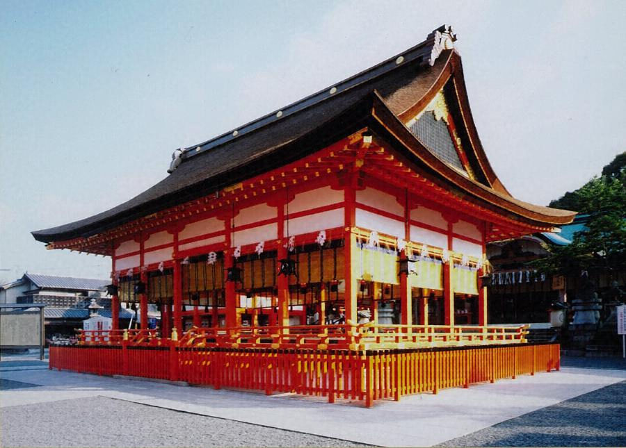 伏見稲荷大社は、稲荷信仰の総本社で稲荷山の西麓に境内を構える。本殿は明応3年(1494)の再建で、重要文化財に指定されている。権殿は寛永12年(1635)の建立で、本殿を一回り小さくした五間社流造の仮殿である。楼門は天正17年(1589)の再建で、和様の意匠である。そのほか、稲荷祭の時に神輿を並べた外拝殿、3室の内陣をもつ奥宮、稲荷神の眷属である狐を祀る白狐社などが良好に維持されおり、近世の稲荷信仰の隆盛を伝える社殿群として価値が高い。既指定の本殿とともに保存を図る。