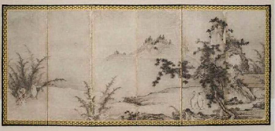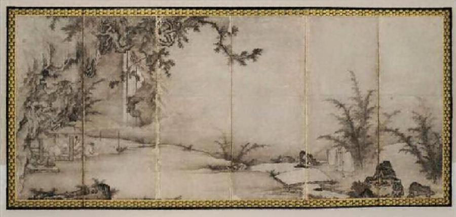 古代中国の故事である「竹林七賢」を題材にした6曲1双の水墨画の屏風である。