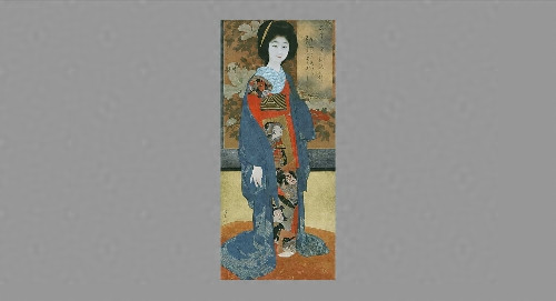 大きな櫛を横向きで髪につけた女性が、北宗の花鳥画家趙昌の落款が見える牡丹図屏風を前に、何やら意味ありげに佇んでいる。はだけた着物や謎めいた微笑が、妖艶な雰囲気をかもし出している。「切られお富」(河竹黙阿弥作「処女翫浮名横櫛(むすめごのみうきなのよこぐし)」を真似る兄嫁の仕草を見て着想を得、その姿を題材として何点か同様の絵を描いたが、本作はそのうちの1点である。大正7年の第1回国画創作協会展に出品されて大きな評判を得、村上華岳に激賞された。画家を一躍時代の寵児とした、甲斐荘の青年時代の代表作である。