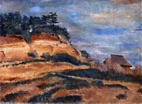 第2回春陽会展に「兄及ビ彼ノ長女」(当館蔵/O-14)「友人ノ肖像」(当館蔵/O-15)「春ノ野辺」とともに出品されて春陽会賞を受賞した作品である。他3点は人物画であるが、本作は当時青年画家たちに写生地として人気のあった千葉県我孫子の風景を描いたものである。受賞しての感想を美術雑誌に寄せた文章の中で「崖の風景等、生々と迫つて来る自然の感じは、どうしても写実の路なしには描けない美しさ」と三岸は記す。同時期の彼の人物画の多くが、写実を離れて稚拙感を出しているのに対して、我孫子の崖を描いたこの作品では、観察の結果をそのまま画面に表現しようとした作画姿勢がうかがわれる。