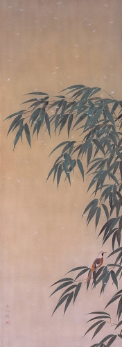 福田平八郎といえば、いわずと知れた近現代京都画壇の巨匠。竹内栖鳳らに絵の手ほどきを受け、画業初期には徹底した写実表現を展開しましたが、次第に対象の単純化・平面化を推し進め、独自の装飾的画風を確立します。雪の舞うなか、竹の小枝にとまるジョウビタキを描いた本作品は、平八郎が中村岳陵や山口蓬春、木村荘八らと結成した研究団体・六潮会の第1回展に出品された作品で、その画業の変遷をたどる上でも大変貴重な作品です。なお、この年の第13回帝展には、平八郎の代表作として名高い《漣》が発表されています。