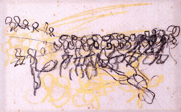 三岸好太郎は1933(昭和8)年、オーケストラの演奏風景を描いた一連の作品を制作した(当館蔵の50号[O-59]、宮城県美術館蔵の50号、焼失した〈新交響楽団〉100号ほか)。それらの油彩画の制作のための準備素描が数多く残されている。そこでは各楽器の演奏者ごとの描写や、指揮者の複数のポーズを描き込んだり、手の動きの軌跡を線で示すなど、演奏の動的な情景を表現するためのシミュレーションも行われている。また、指揮者を正面からとらえたものや、最後列のコントラバス奏者を後ろから描いたものもみられ、三岸が客席から見た情景ばかりでなく、舞台裏にまで入ってデッサンしていたことが推測できる。コントラバス奏者が支えに使用した三角の台(通称ヤマ台)や、簡略ながら描き込まれた天井などがみられるものもあり、日比谷公会堂の特徴を示すという。こうした素描は、鉛筆による簡略なスケッチ的なものから、コンテやクレヨンを用いてのもの(当館蔵D-13~21など)まで、様々な段階のものがみられる。〈ひっかき〉の手法を駆使した油彩画〈オーケストラ〉は、一見即興風にも見えるが、その制作にむけては、三岸が現場やアトリエで入念な準備を行っていたことがうかがわれる。