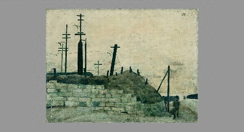 松本竣介(1912-1948)の都市風景には、駅や橋、教会など、ヨーロッパの街角を描いたような堅牢な洋風建築が多く登場します。この作品では、車両基地近くのためか、明瞭な建物らしき姿はなく、煉瓦で囲まれたなだらかな草地が広がるばかり。画面に変化をもたらすのは、かたちも不揃いな電柱や街燈。シルエットと化した柱の大きさの違いが、いくらかの遠近感を伝える一方、薄塗りの明るい空を背景に浮かぶ、途切れそうな繊細な電線は、奥行きの定かでない絵画空間の中で、行き場を失ったような心細さを感じさせます。