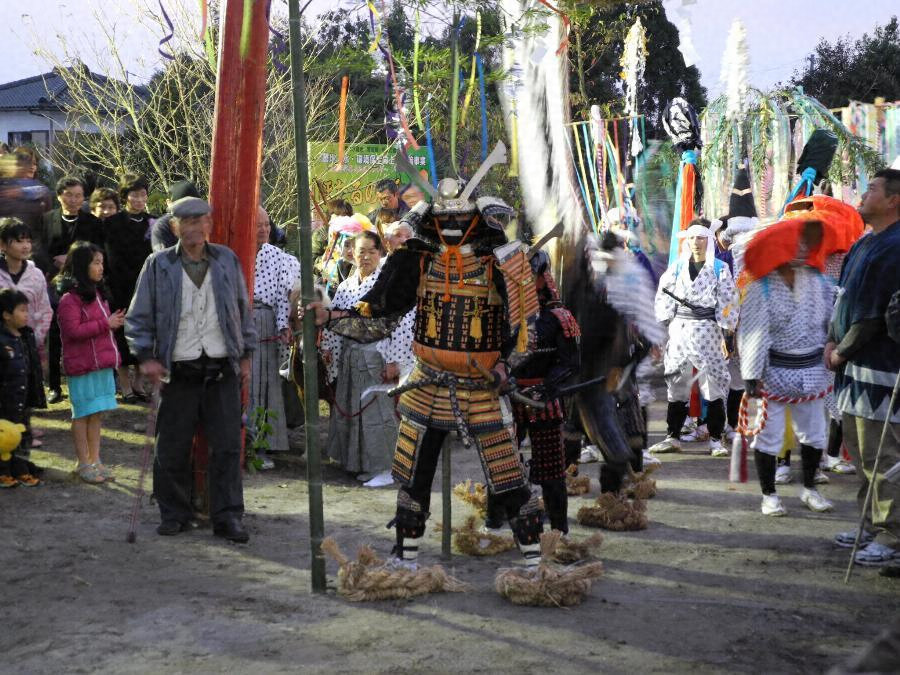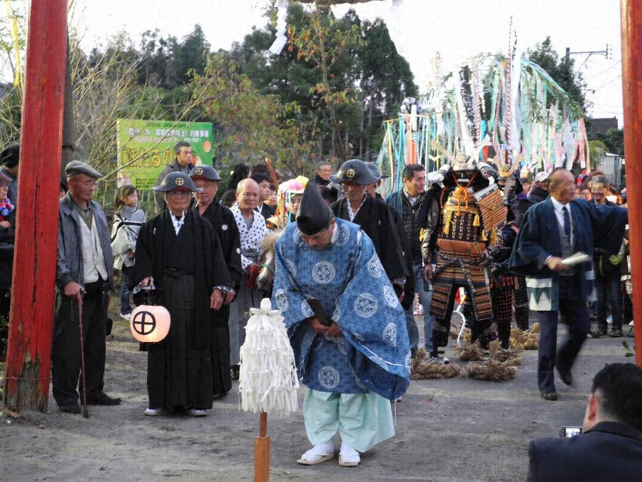 まず、「どしん」が入ってくる。槍を持った者が「したい、したいー」と大声を張りあげ、いら棒を持った者は、棒で地面をつきながら「まくど、まっど」と叫びながら、ゆっくり進む。次に、「薙刀」が入る。腰を曲げ、足を高く上げて、跳躍して踊る。続いて、「荷馬」の番である。境内を激しく駆け巡る。次に「まとい」が、「どこい、どこい」と叫びながら境内を激しく踊り回る。次に「立笠」が入ってくる。前後2名ずつで採り物を交換しながら進む。この時、「あわんつ」「こめのつ」と歌いながら、胸の前で両手を合わせながら腰を下げて両手を伸ばし、相撲のちりをきる動作をする。次に「やぼ」が入る。「とがさ」の中へ入る動作をする。歌謡は立笠と同じ。次に「はぐま」が入る。はぐま草をつけた毛槍を回しながら進む。次に「やっか」が、七夕飾りのような採り物を持って進む。次に「はさみ箱」にかわると、左右二列になり、黒塗りのはさみ箱を前後が互いに渡す。その時、手にした方が「受け取った」という。箱は動作のたびにジャラジャラと音がする。次に後番の「薙刀」が入ってくる。「しろのけ、しろのけ」と歌い、動作は前番と同じ。次に「荷馬」が再び境内を激しく駆け巡る。次に「おほろ」である。「まとい」と同じように「どこい、どこい」と叫びながら境内を飛び舞う。次に「稚児馬」が入ってくる。稚児は介添えの付人と親を従え、社殿で修祓をうける。この神事が終わると、「棒舞」である。花棒を持つ者が境内に並び、陣形を変えながら舞う。