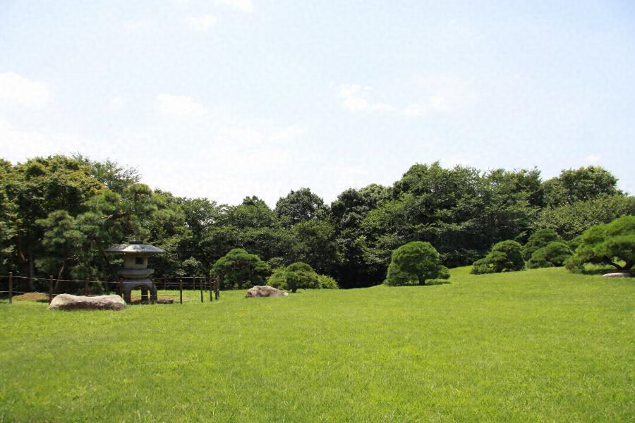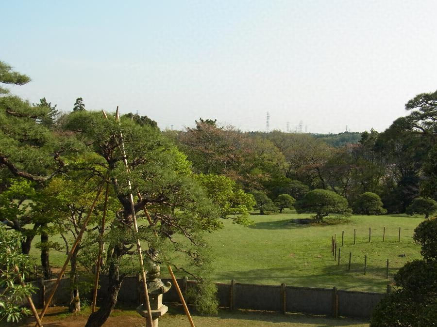 主屋の周りには庭木をはじめ燈籠(とうろう)・手水鉢(ちょうずばち)・景石(けいせき)などを設えて和風の庭園とし,建築との調和を図っている。その外側には広い芝生地を設け,園遊会などに用いた。庭園は尾根状台地及び谷津という当該地域の地形を利用することによって眼下の水田及び高崎川,対岸の台地を借景として取り入れた。