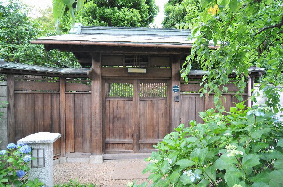 敷地東辺南寄りに位置し、八幡通りに向けて開く。一間一戸の腕木門で左右に袖塀を附属する。わずかに起りをつけた切妻屋根を軽やかにかける。袖塀は竪板壁の上部を挽き板の目透し欄間とし、銅板葺の屋根をかける。主屋前の庭園とともに閑静な佇まいを醸す。