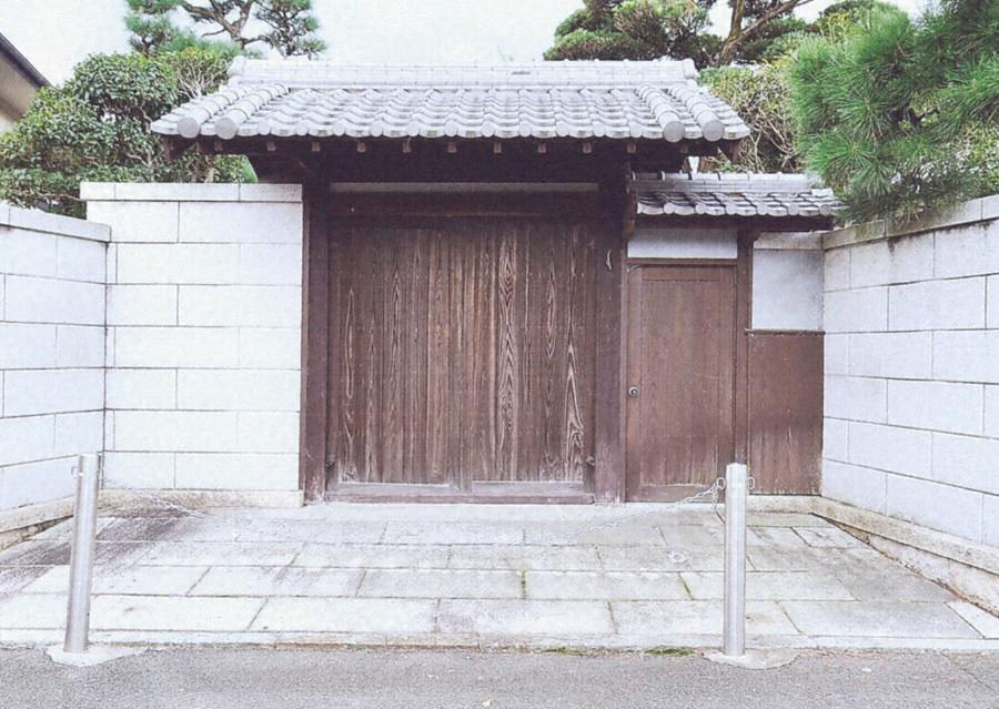 敷地の北辺東寄りに道路から奥まって開く一間一戸の腕木門である。門口は二・一メートル。起り付きの切妻造桟瓦葺で一軒疎垂木とする。内側ではナグリ仕上の控柱が腕木を支える。門扉は両開板扉で、上部に筬欄間を飾る。小規模ながら丁寧な造作の門である。
