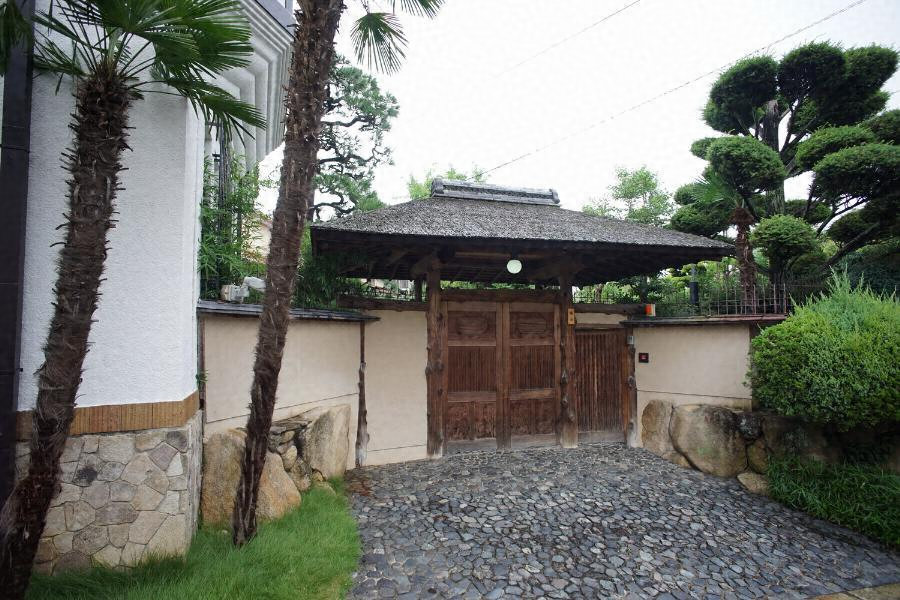 敷地西側の道路際に南北棟で建つ。腕木門の形式をとるが、主柱は出節付の丸太とし、両開の桟唐戸には、下段に木目を砂摺とした鏡板、中段に挽割の柾目板、上段に連子状の板を嵌め、屋根はこけら板を葺いた上に杉皮を葺く。数寄屋意匠をふんだんに用いる。