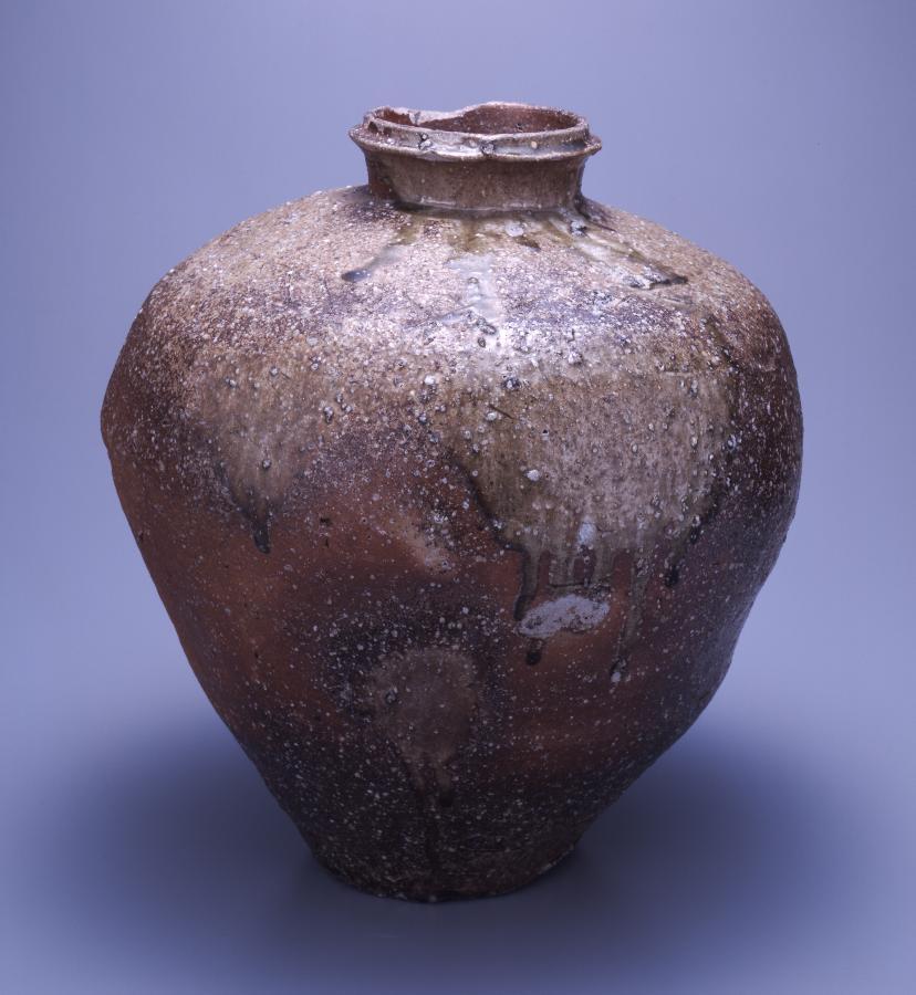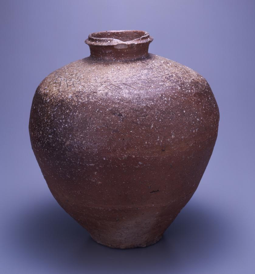 中世を代表する古窯の一つである信楽の壺。強く張った肩や胴部に比較して底部が小さい形など、室町時代初期の特徴をよく示している。口縁部は、信楽に特徴的に見られる、上端近くに一条の凸帯を廻らせた二重口縁。肩に、14 世紀後半~15 世紀に盛んに用いられ、信楽を代表する文様となった檜垣文を廻らす。