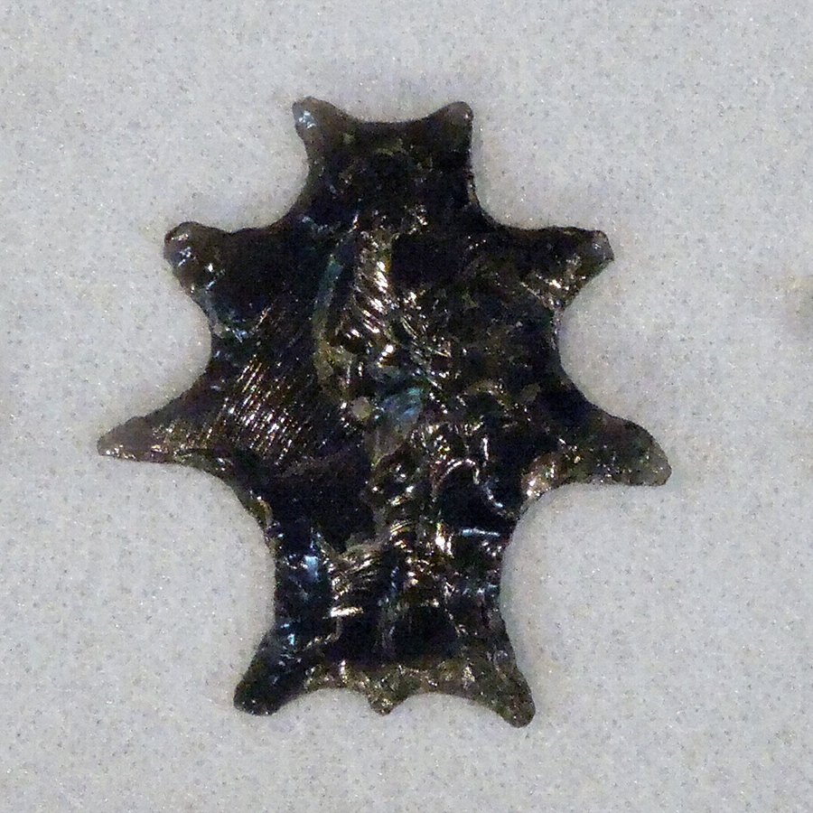人物・動物などをかたどったと見られる石器で、この例はムササビを模したのではないかと考えられている。こうした異形石器は続縄文時代の北海道から千島列島にかけて広く見られる。
