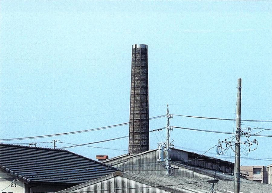 工場建物の南東寄りに位置する。小口積の煉瓦造で、基部平面は直径三メートルの円形とし、高さは二四メートルを測る。現在は鉄製アングル材で補強される。窯業が盛んな当地の歴史を物語る遺構として価値があり、同工場の角形煙突とともにランドマークとなる。