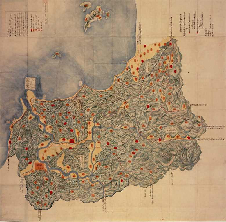 大洲藩領と新谷藩領の村々が描かれた絵図。村の名前を書き込んだ小判型の村形の色が、大洲藩領(橙色)と新谷藩領(朱色)とで分けられており、郡の境には銀色の境界線が引かれ、郡ごとに大洲藩領の村数・石高が記されている。また、山間部と平野部が色分けされており、村の立地状況が分かるほか、街道・川・一里塚・蔵屋敷・番所なども描き込まれている。本資料は、大洲藩10代藩主加藤泰済の命により、家臣の東寛治が2代藩主泰興の時代の原図をもとに、その後の変更点も加味して作成したものである。