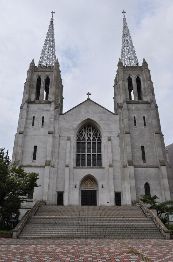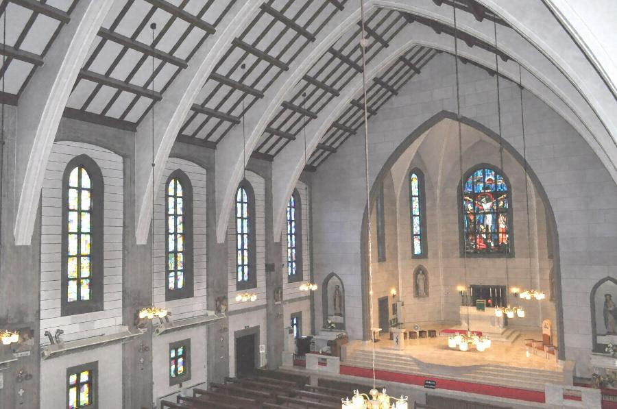 市街地に建つ鉄骨鉄筋コンクリート造の教会堂。ゴシック様式基調で外壁をコンクリート打ち放しとし、双塔に透模様の尖塔を戴く。柱通りの内部に尖頭アーチを架け、外部にバットレスを付して高大な無柱空間を創出し、小屋を現した天井とともに昇高性を強調する。
