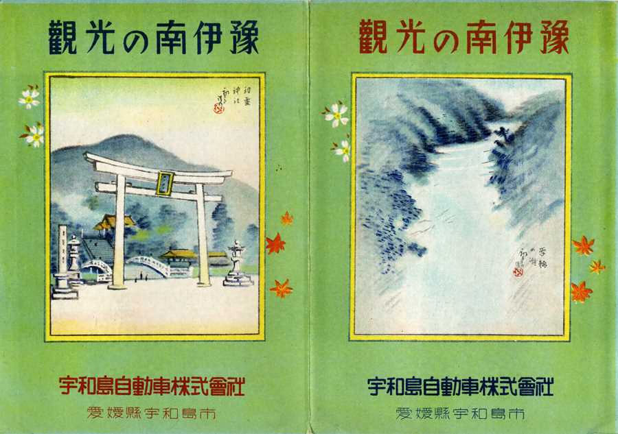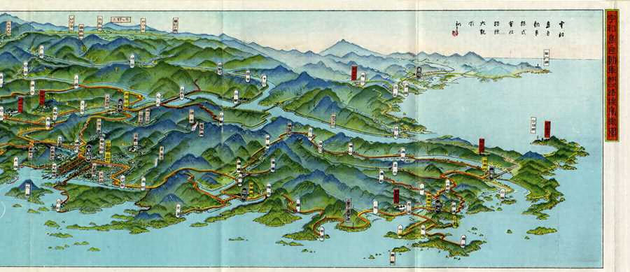 宇和島自動車株式会社々長村重嘉三郎の依頼を受け、同社のバス路線を描いた絵図。南予を中心に路線が張り巡っている。初三郎の宇和島訪問は、大正11(1922年)年以来であった。裏面でこの絵図について、「南伊予全地域にわたる景勝山河の大風光裡、本社バスの交通と観光の一大文化記録画」と述べている。