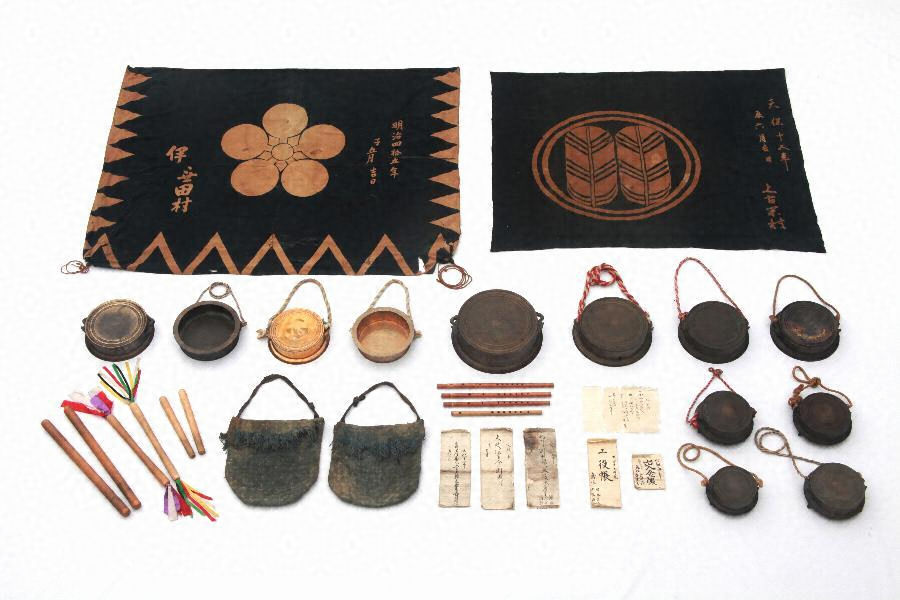 これらの太鼓のほかに,太鼓の胴に掛けた油単や太鼓のばち,担ぎ棒,太鼓とともに使用された鉦(かね)や笛,革の張替時などに書かれた古記録もあり,関連資料として附にしている。