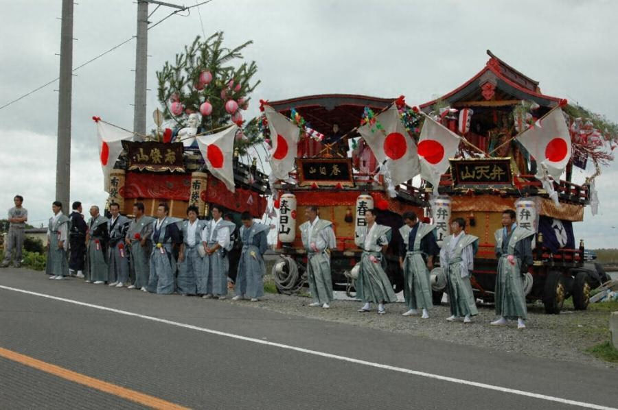 8月16日:神社の前に山車が揃い、それぞれの山車がヒョウシ(囃子)をつける。神事が開始され、神楽が奉納される。ヒョウシは神事が終わるまで続けられる。