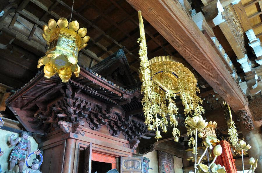 温泉街奥寄りに位置する下段境内の中心仏堂。正面三間側面四間、一間向拝付。内部を前後に二分して内陣奥に須弥壇を置き、近世密教系仏堂の一類型を示す。内外の要所を彫刻で飾り、特に向拝は、虹梁上の龍、柱上に並置した籠彫の手挟など、いずれも秀逸である。