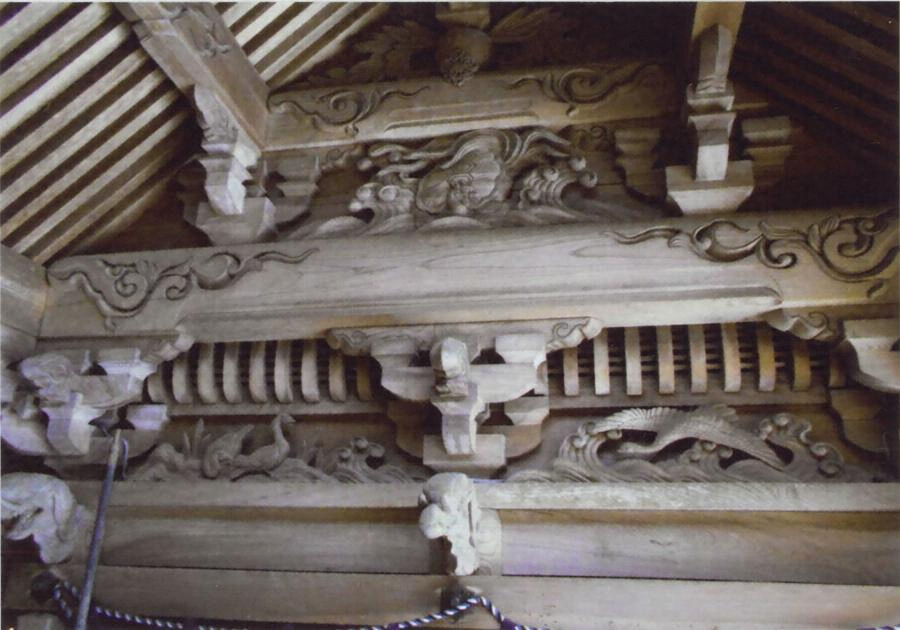 山間の境内上段に西面する覆屋内に建つ。三間社流造、軒唐破風付で、庇は中柱を省き一間とする。三方に縁を廻らし、妻は出組で二重虹梁の妻飾を受ける。彫刻は中井清次郎正用の作になり、向拝廻りの龍や鳳凰の濃密かつ躍動的な彫刻に彫物師中井家の作風を示す。