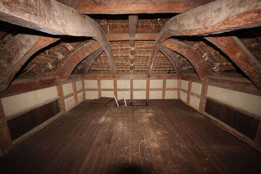 敷地南面を画す。桁行九間、梁間三間、寄棟造、茅葺(鉄板仮葺)。中央に門口を開き、両脇に室を設ける。小屋組は、隅木や梁に大きく湾曲したチョウナ梁を用い、端部は持送りにし出桁を受ける構造を持つ。屋敷構えに格式を添える長屋門。