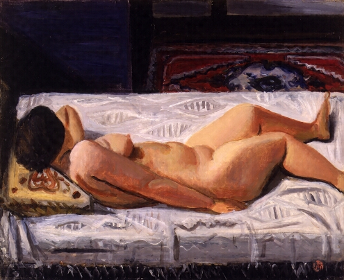 小出の画風を画するものに、1921年から翌年にかけての渡欧体験があげられる。それまでの緊密な構図に支えられた重苦しいほどの色調と執拗なまでの筆致は、渡欧以後払拭され、ねばり強い描写にもかかわらず、平塗りの大胆な筆遣いと薄塗りのために画面は軽妙なものとなった。こうした変化の背後には、滞欧中に得た芸術をはじめとする西欧と日本との差異に対する深い認識と、洋画家として模倣に終始するのではなく、あえてその断層を克服しようとする強い意志があった。そして小出自身の美意識や嗜好にもとづいて見いだしたものの一つが、日本の裸婦の美であった。小出は、「日本人の黄色に淡い紅色や淡い緑が交つてゐるのも私は白色人のもつ単調な蛾の様な不気味さよりも、もつと異常のあたたか味と肉臭をさへ、私は感じる事が出来ると思ふ」(「裸婦漫談」)と述べ、さらに日本人特有の胴長のプロポーションについても、理想化を求める西欧美術の底流にある美意識とは異なって、ありのままの姿を是認している。〈裸女と白布〉は、その美意識を表現することに成功した〈裸女結髪〉(1926年)から〈支那寝台の裸婦〉(1929年)までの一連の裸婦像のなかの1点である。横たわる裸婦の弾力のあるつややかな肌色は、シーツの白さとの鮮やかな響き合いによってひきたち、フォルムはおおまかな筆致ながら的碓にとらえられている。
