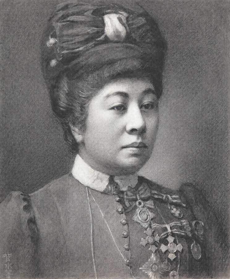 篤志看護服姿の鍋島栄子(侯爵鍋島直大夫人)の肖像画。栄子は日本赤十字社の篤志看護婦人会の会長を明治20年(1887)~昭和11年(1936)まで約半世紀の永きにわたって務めたほか、東洋婦人会会長や大正婦人会、共立婦人会など各種団体の要職を歴任し社会活動に積極的であった。