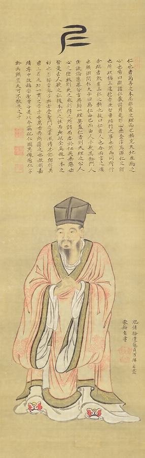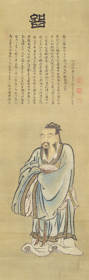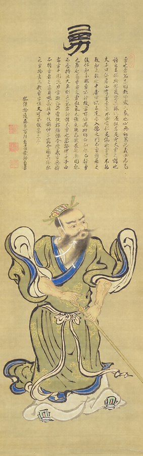 孔子門弟の曾子・子貢・子路の図。作者は佐賀藩歴代藩主のうち屈指の画人である3代藩主鍋島綱茂。余技としての大名芸の域を超越した筆運びを見せる。儒教の人物画や仏画の作例が多いが、孔子の弟子を描くのは現在のところ本品しか知られていない。