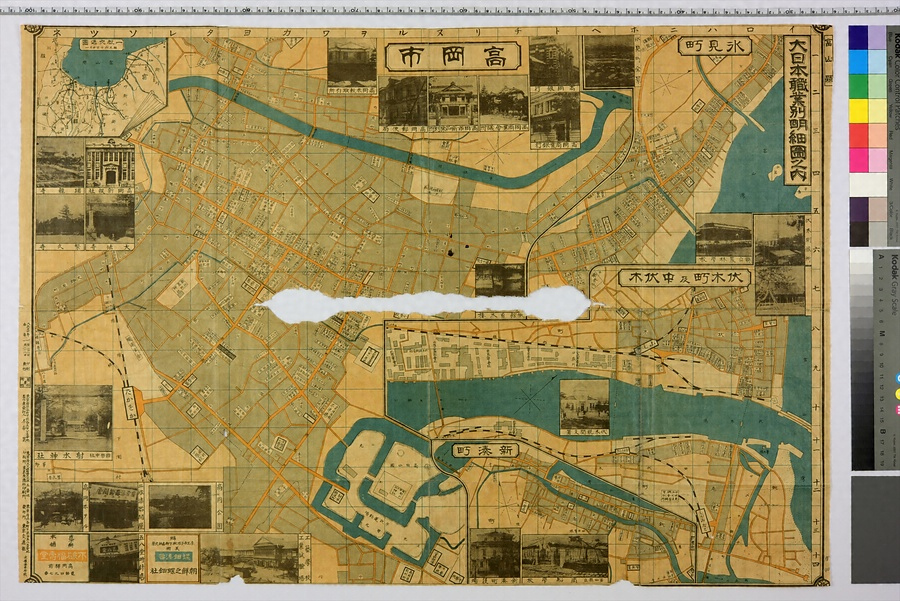 本資料は高岡市街・伏木・氷見・新湊周辺の商業施設地図である。表面の地図右上に「大日本職業別明細図之内」とある。右端には縦に「一」から「十四」、上部には右から横にいろは順に「イ」から「ネ」とあり、地図が区切られている。これは裏面の「営業別索引」とリンクしている。地図上には高岡市街を中心にそれぞれの町の商店・会社・学校それぞれの名称が記されている。また、左上には小さく富山県の「一般交通図」(縮尺60万分の1)がある。左端には「大正十四年一月二十六日 印刷/同年一月二十八日 発行」「著作/兼/所有」「東京府渋谷町下渋谷五百八十三番地/著作兼発行人 木谷 賀」「東京府大久保町西大久保五番地/東京交通社印刷所」「東京府渋谷町下渋谷五百八十三番地/発行所 東京交通社」「定価金参拾銭」とある。