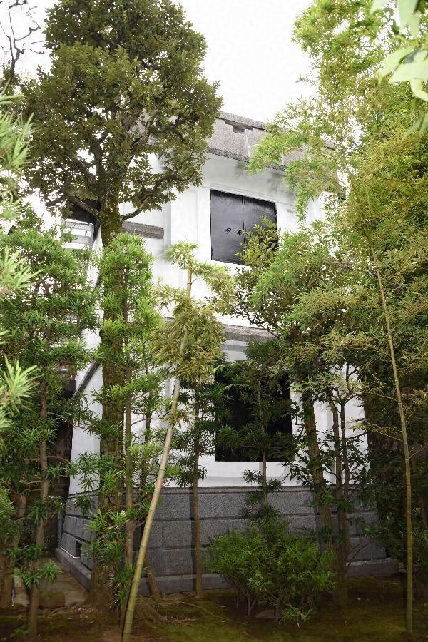 美術品収蔵用に建てた鉄筋コンクリート造二階建で、茶室北端に接続する。桁行四・九メートル梁間三・九メートル、陸屋根で壁頂にパラペットを廻らせる。外壁漆喰塗で腰の石積風意匠とコーニス風の水切を人造石洗出しで作る。耐火性と意匠性を兼備する収蔵庫。