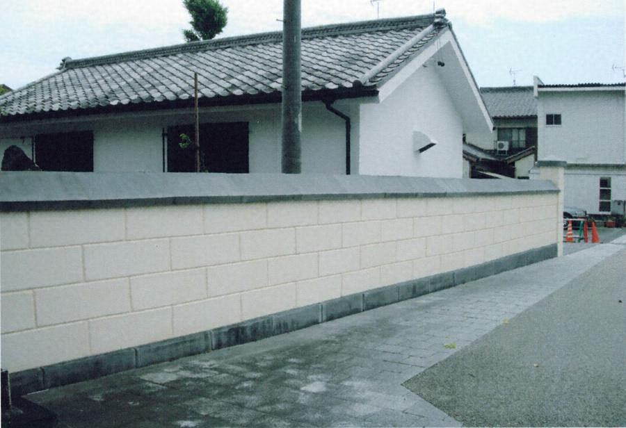境内西辺を画す門柱と土塀で、いずれも三和土を成型した中空ブロックを積む。門柱は五段積として頂部に宝形造屋根を載せ、土塀は版築基礎上に四段布積し、同じ三和土で切妻屋根を造る。左官技法を駆使した独特な構造の門塀で、当地の建築技術を伝える希少例。