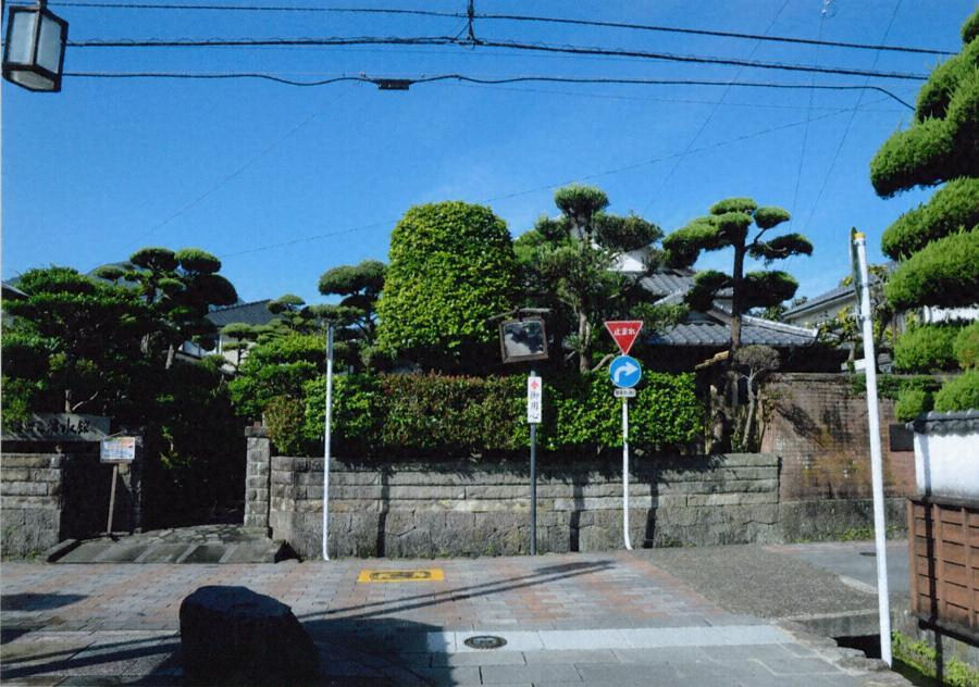 敷地東面に沿って流れる湧水溝沿いに建つ。南寄りに石柱門を開き、左右に重量感のある石塀をのばす。石塀は切石積基礎上に、長さ約二メートルの横長材を江戸切仕上げとして四段積む。鯉の泳ぐ湧水溝とともに、新町の表通りの景観を形成する要素となる。