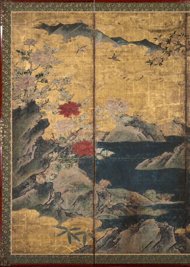 紙本金地著色四季花鳥図〈狩野宗秀筆/六曲屏風〉