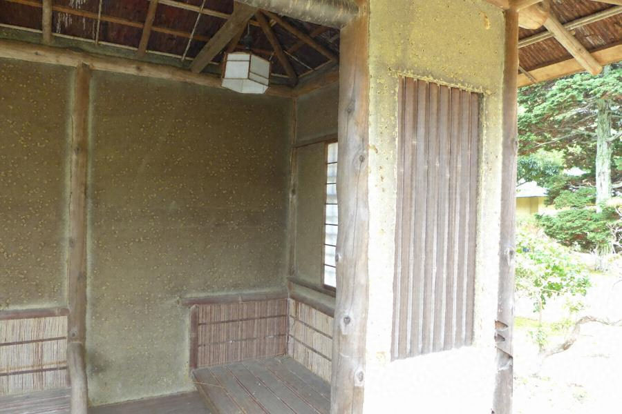 客間棟の東、庭の南端に本館と対面して建つ腰掛待合。北面を吹放ちとし、南面は壁、東面には中敷居窓、西面には下地窓を入れた土壁とする。室内南と西には腰掛を設け、土間床は洗い出し、屋根は寄棟造杉皮葺。小規模ながら意匠を凝らした待合である。