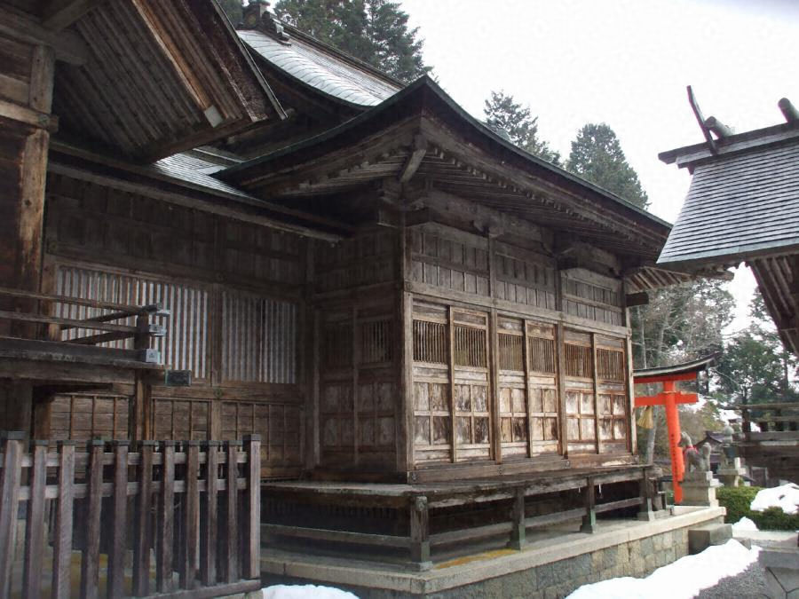 本社拝殿の右方に並んで建つ。妻入の入母屋造銅板葺で、背面右方に神饌所、本殿との間に釣殿が附属する。江川三郎八の設計になり、吹寄垂木、特徴あるトラス架構、格天井など、その特徴をよく示す他、正面側基礎石を洋風意匠とするなど特徴ある意匠を見せる。