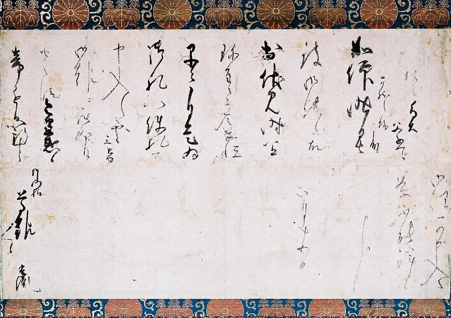 この手紙は恐らく二十代前半の御書状で、宛名「竹門様」は京都一乗寺竹之内町曼殊院門跡で、覚恕法親王である。内容は昨日伏見にお供したお礼の行き違いに恐縮したお断りの様子が見える。折紙形式の下半分を切断して二段書きの形に仕立てた表具である。曼殊院には古今和歌集(色紙・国宝)、源氏物語・池坊専好立花図・古今伝授関係史料(各重文)など文芸の書籍が伝世している。返し書きの「烏大」は烏丸大納言である。(『名筆へのいざない―深遠なる書の世界―』海の見える杜美術館2012 解説より)