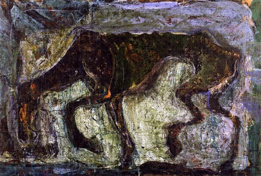 ≪馬≫は、30年代末の「シシ」の連作や≪眼のある風景≫などに一つの頂点をみる、塗っては削り、削っては塗り重ねるという作業の繰返しを特色とする作品群に位置づけられる。この技法は、一面では描かれる「対象」の崩壊を誘発する。一説にはアジャンタの壁画に描かれた群馬をモチーフにしたとも言われ、極端に抉られた腹、かぼそい四肢のうなだれた馬は、崩れ落ちつつある壁面に描かれたかのような様相を呈する。しかしその一方、この技法の持つ積層性によって獲得される堅固なマチエールや構築性と、下層の色彩が部分的に透過するという油絵具の透明性を生かした繊細な色彩変化とにより、そこには重層的で奥深い絵画「空間」が出現する。